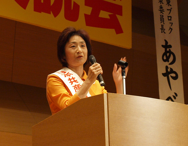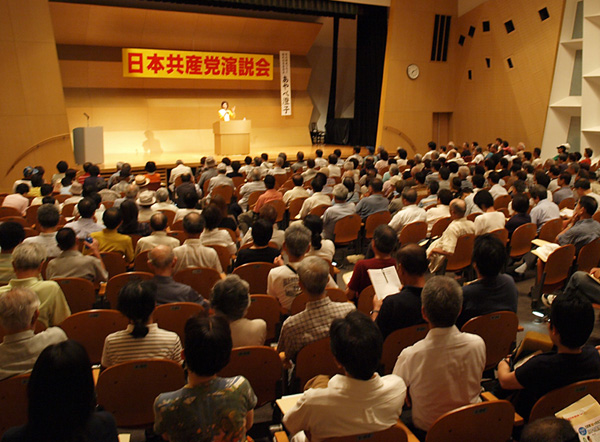 この演説会に300人をこえる参加者がホールの客席を埋め、あやべ氏の話に真剣に耳を傾けました。